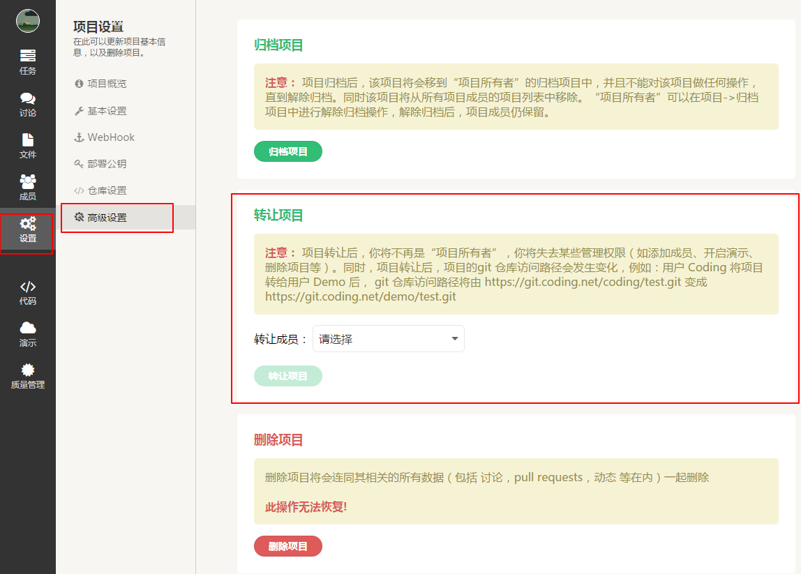 进入 coding 项目后台的高级设置中,有个转让项目的选项,可以将项目转让给项目成员(如果项目没成员就先去添加呗)